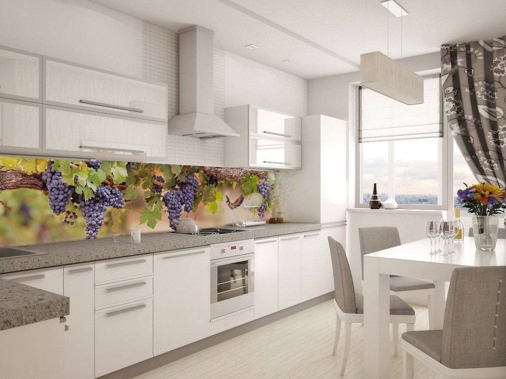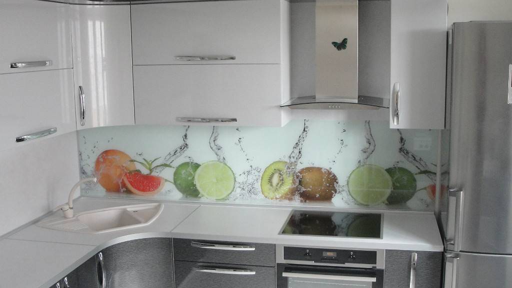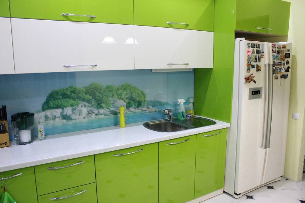 Для кухонь с белым глянцевым верхом стоит выбирать осветленный стеклянный фартук, поскольку зеленоватый оттенок может испортить всё впечатление от выбранного дизайна. Особенно это касается рисунков на белом фоне.