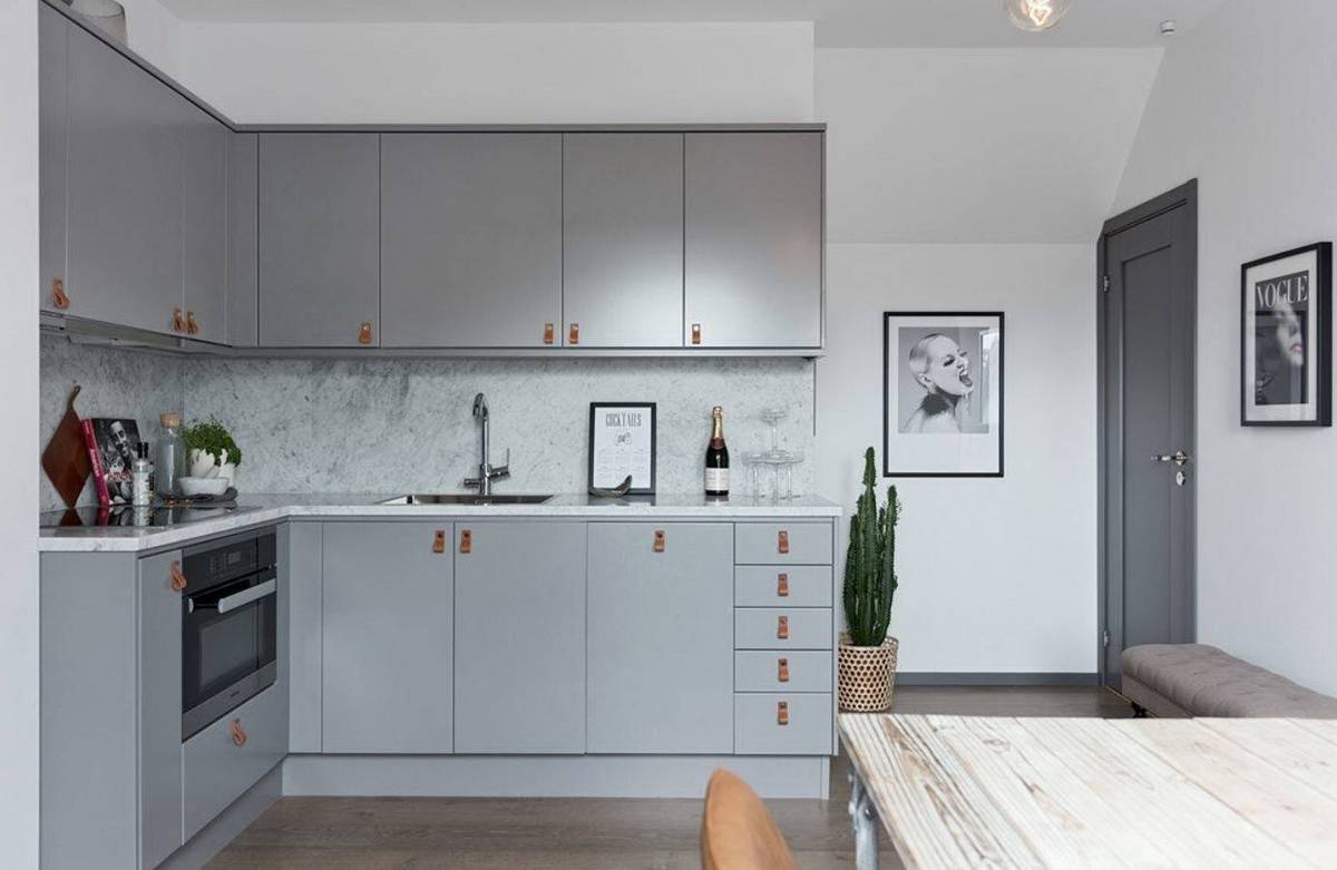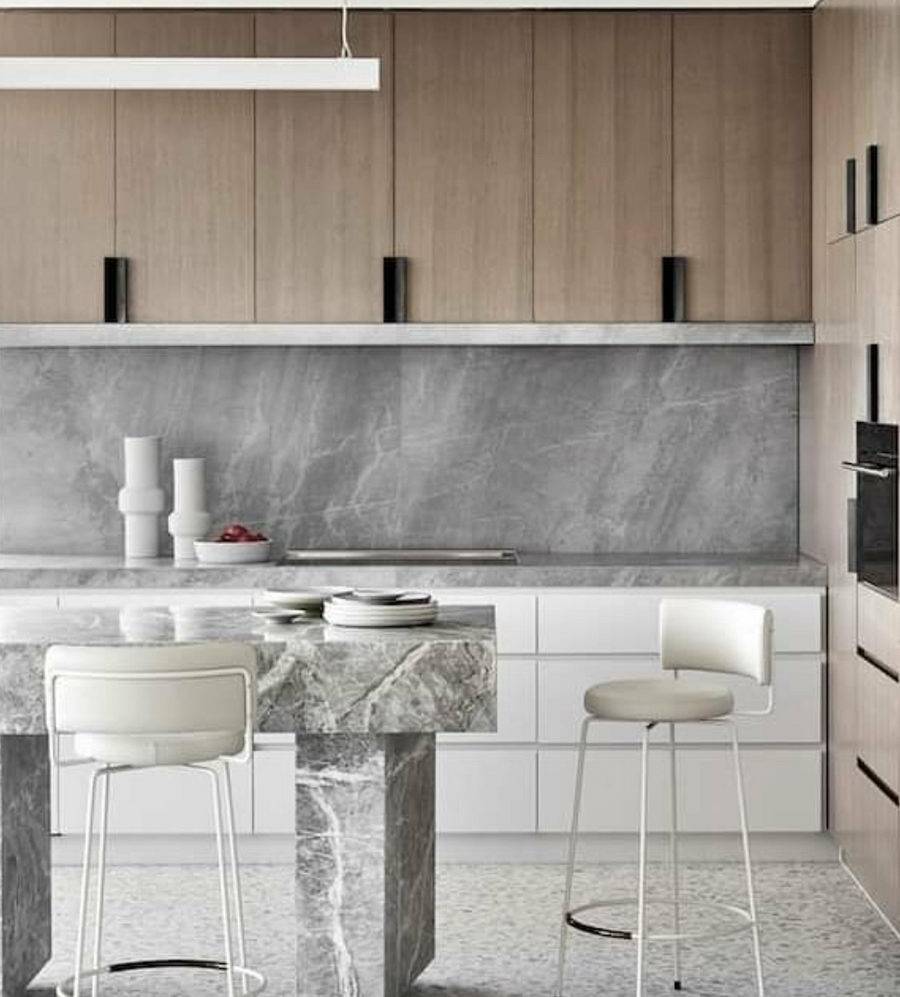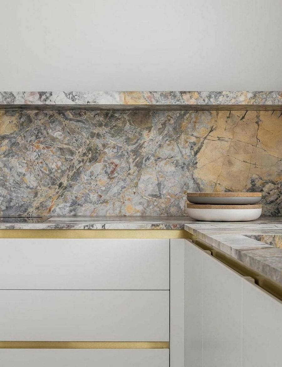 Хотите создать кухню в стиле минимализм? Оформите белый фартук из мрамора и добавьте в интерьер серые аксессуары.