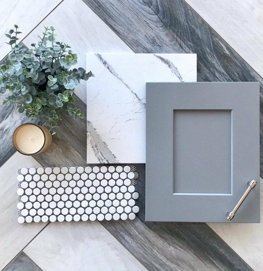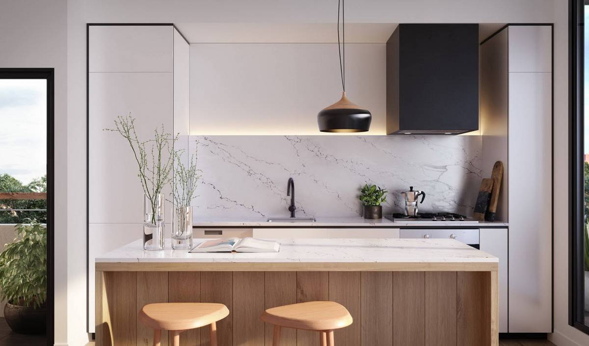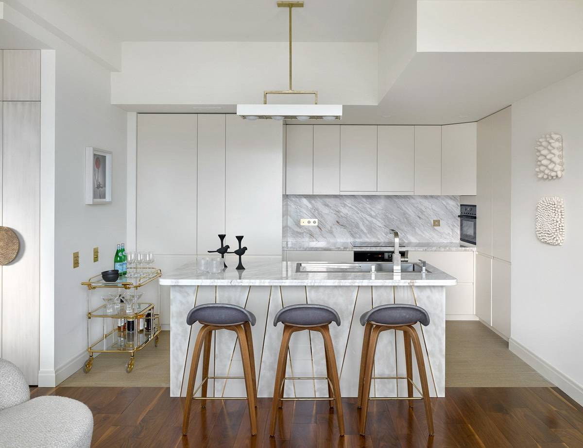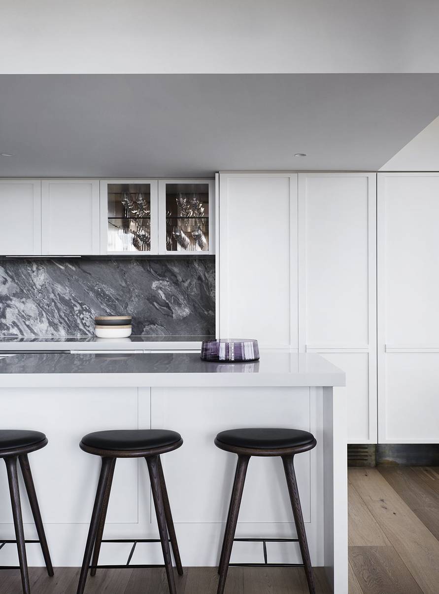 Хотите создать кухню в стиле минимализм? Оформите белый фартук из мрамора и добавьте в интерьер серые аксессуары.