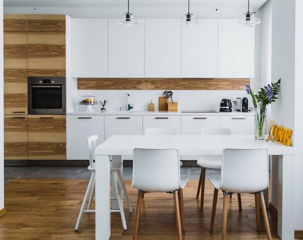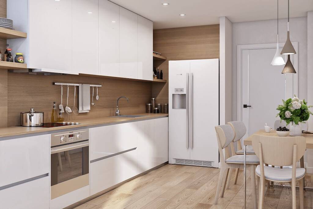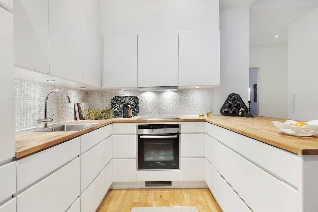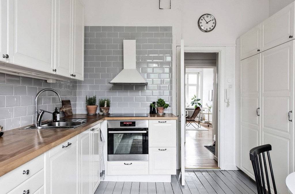 Одно из самых популярных решений в интерьере кухни — белые фасады и деревянная столешница