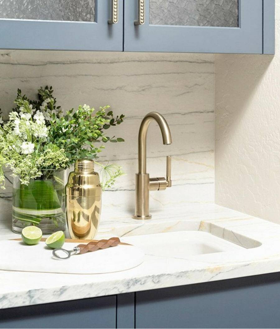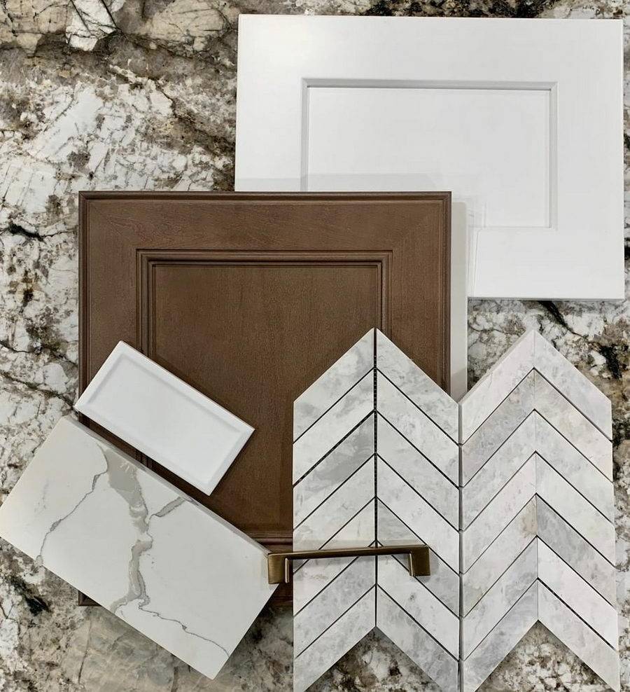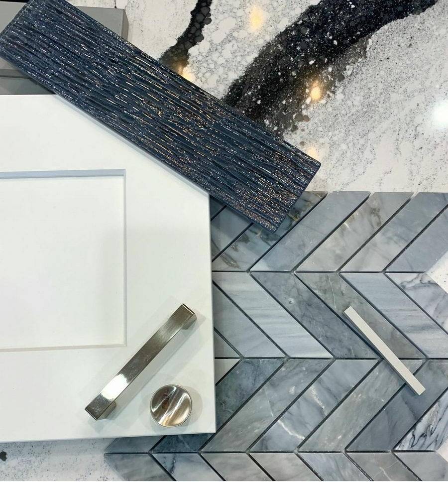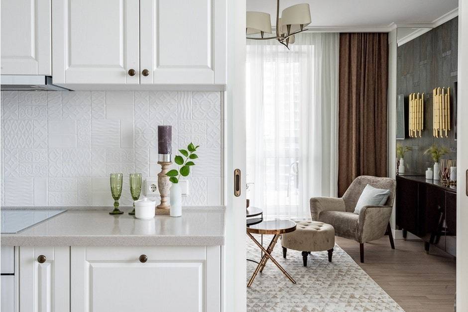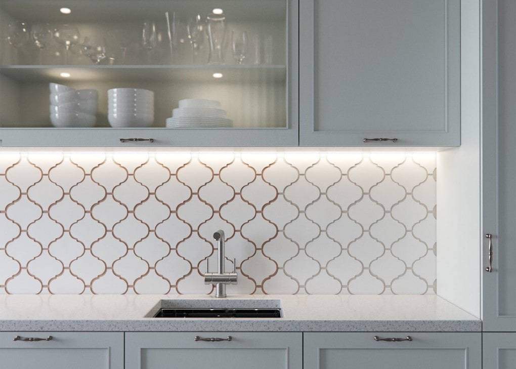 Современное прочтение классического стиля обеспечит вам уникальный и современный дизайн интерьера. Серая мраморная столешница гармонирует с рельефной узорной белой плиткой.