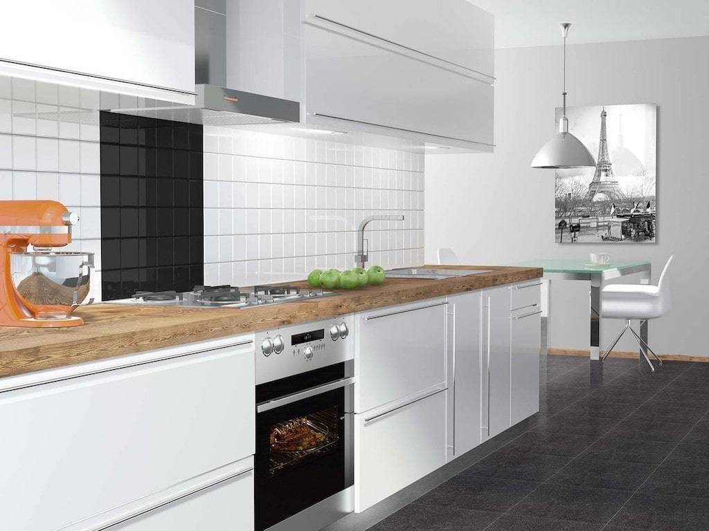 Фартук может быть отдельным акцентом для белого гарнитура или же дополнять столешницу в тон. Совсем необязательно выполнять его из массива — из соображений практичности. Вполне можно поискать замену, например: