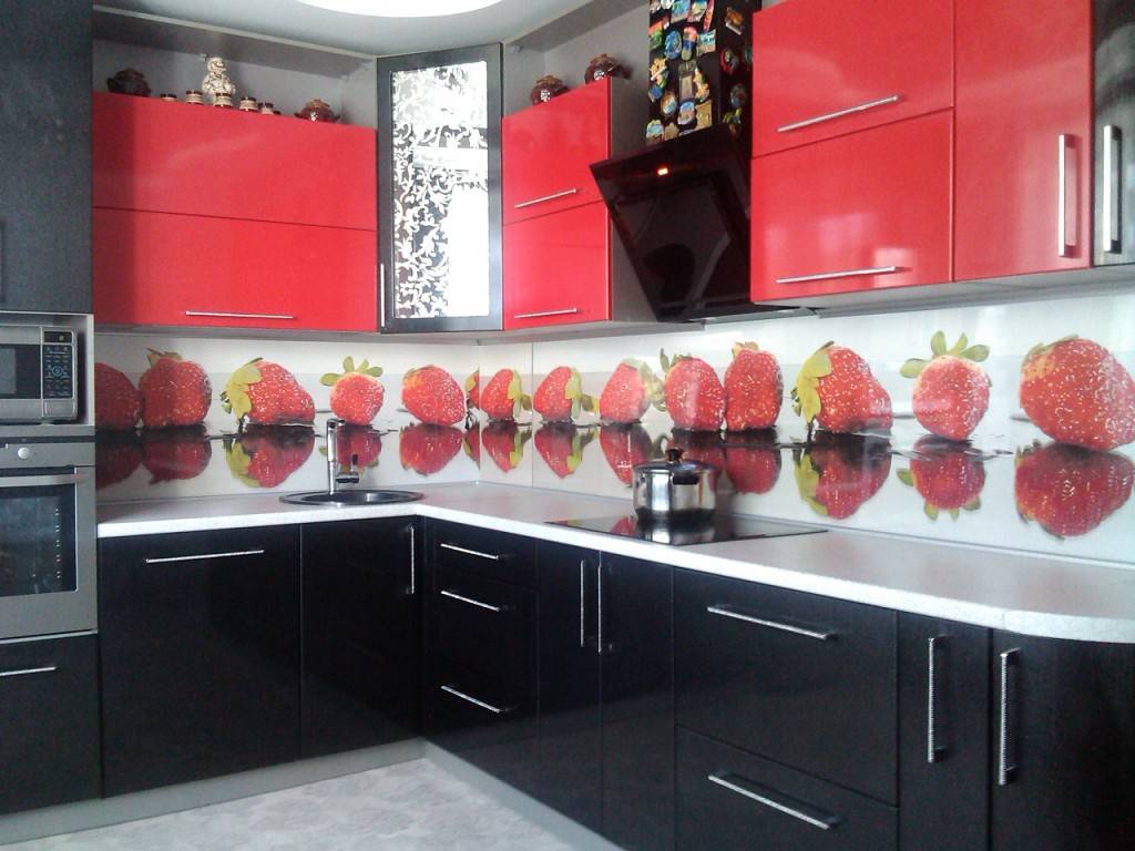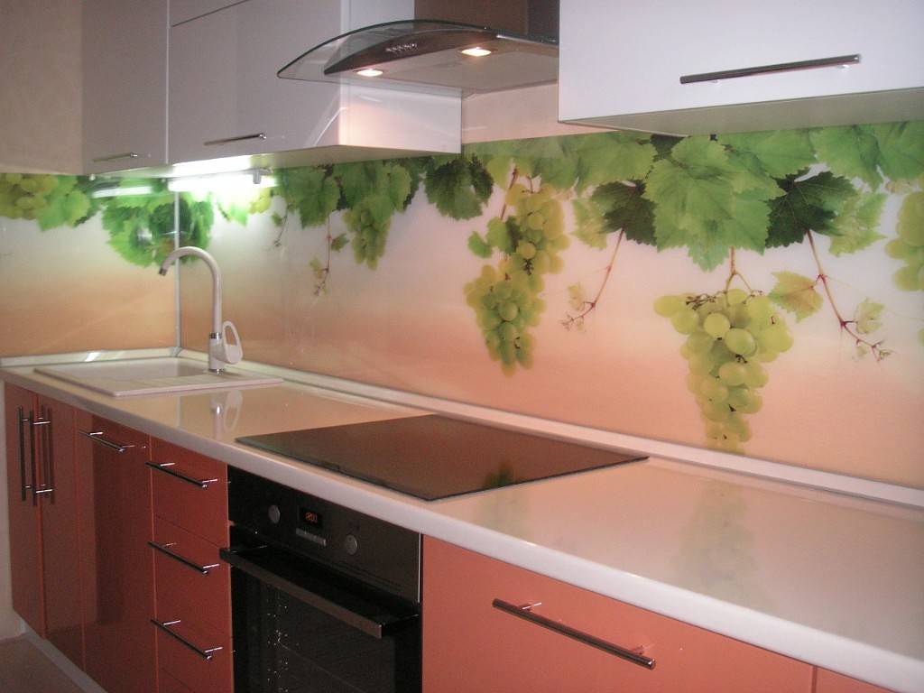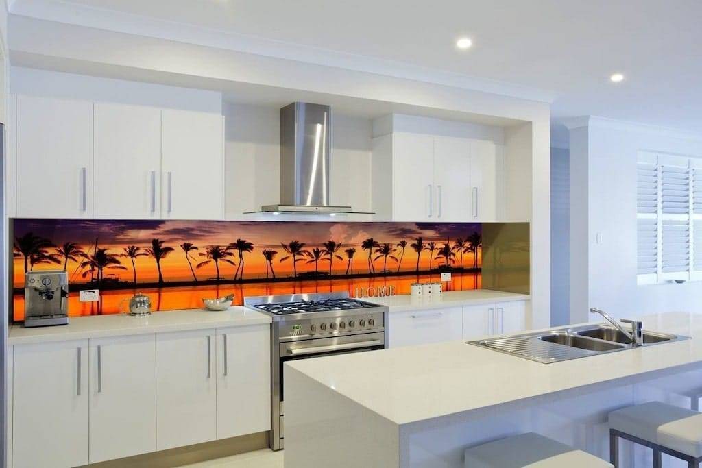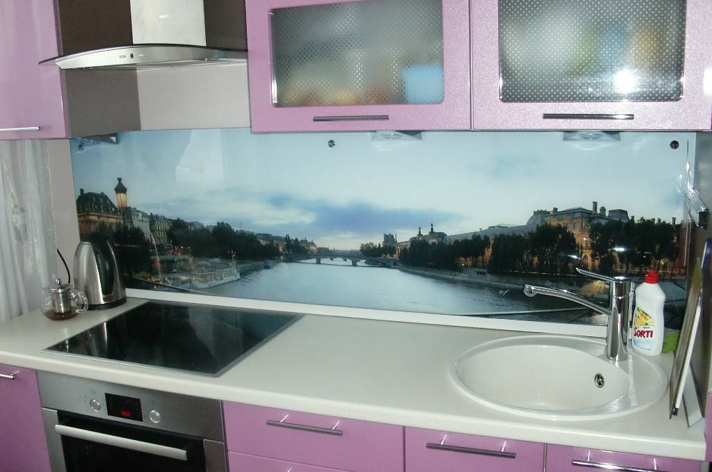 Также стоит знать, что длина фартука из закаленного стекла может быть до 2,5-2,8 метров, иначе при обжиге в печи оно трескается. По этой причине стоит тщательно планировать места стыков – за трубами, на поворотах или в невидимых зонах кухни.