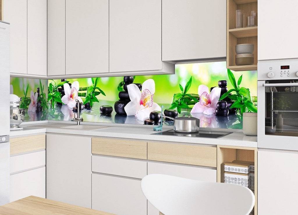Цветной фартук с нежными орхидеями запомнится гостям надолго — картины природы отлично подходят для этого помещения, они умиротворяют после тяжелого рабочего дня и поднимают настроение ранним серым утром.