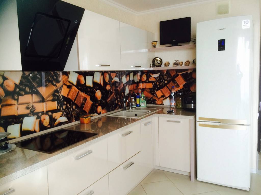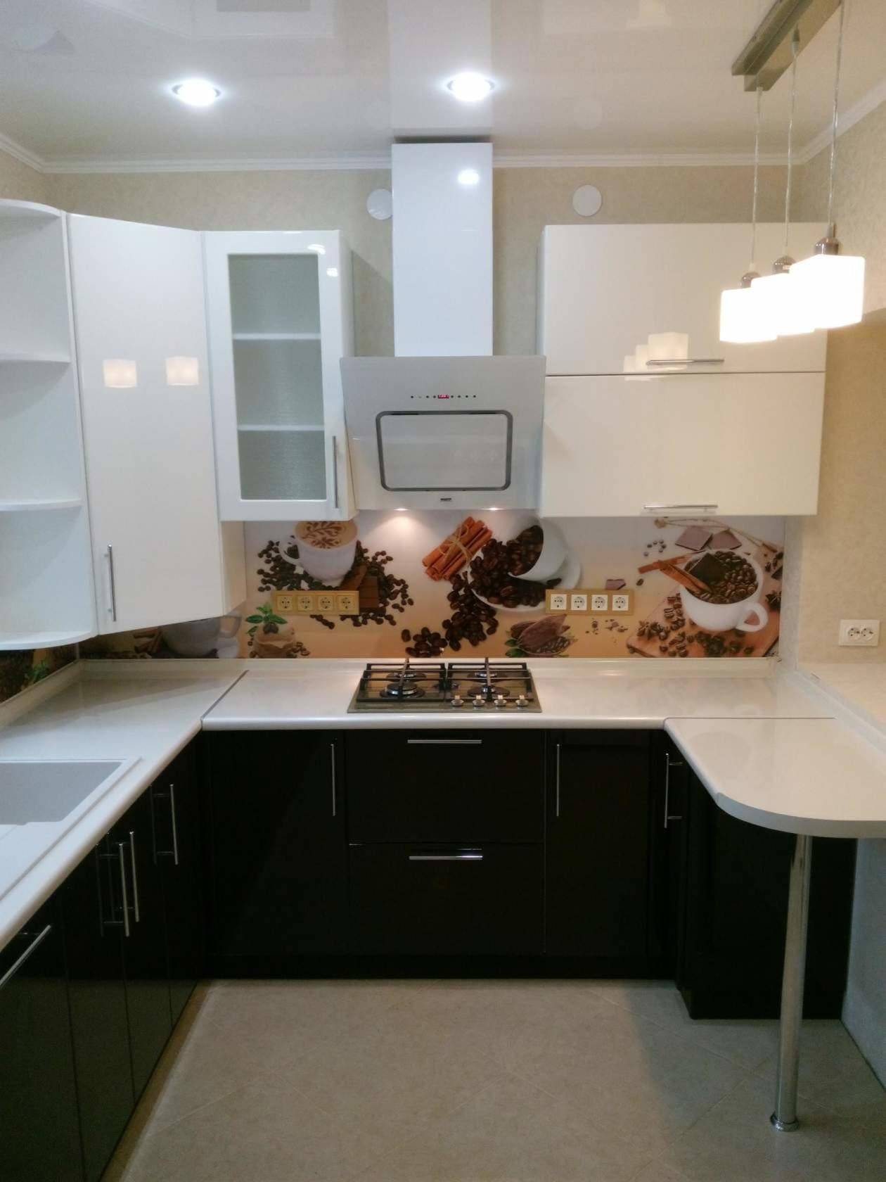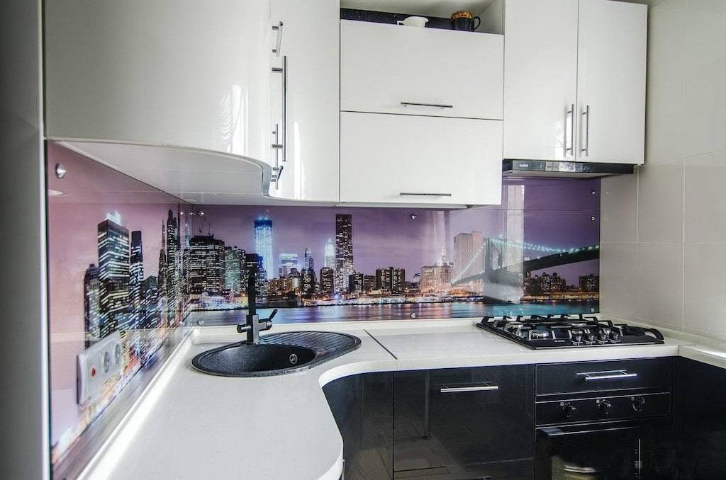Обратите внимание, навесные шкафчики белоснежные, а нижние — черные. Фартук с фотопечатью — достойный выбор