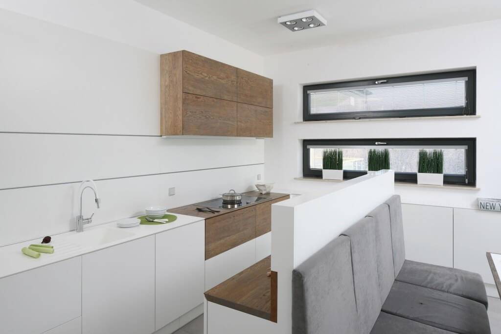 Это решение подойдет для более просторных кухонь, поскольку «деревянные» верхние шкафы могут зрительно сужать пространство. По этой причине лучше остановиться на белом цвете стен и тщательно продумать освещение, чтобы кухня была буквально наполнена светом.