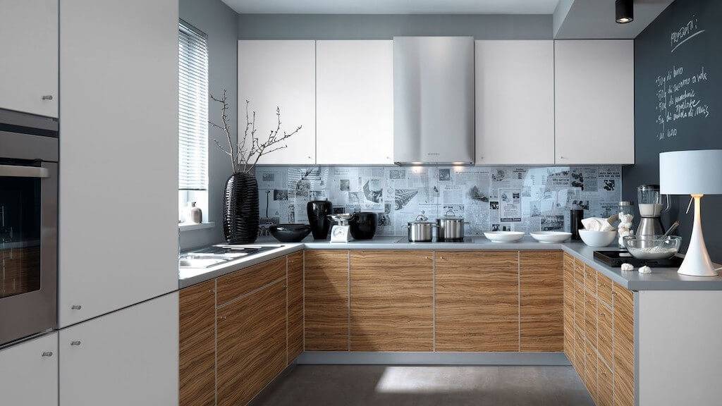 Универсальный вариант, который будет хорошо выглядеть даже на самой маленькой кухне. Бонус в том, что грязь или следы от рук на «деревянном» гарнитуре будут не так заметны, как на белом — это особенно ценится, если в семье есть любопытные маленькие дети.
