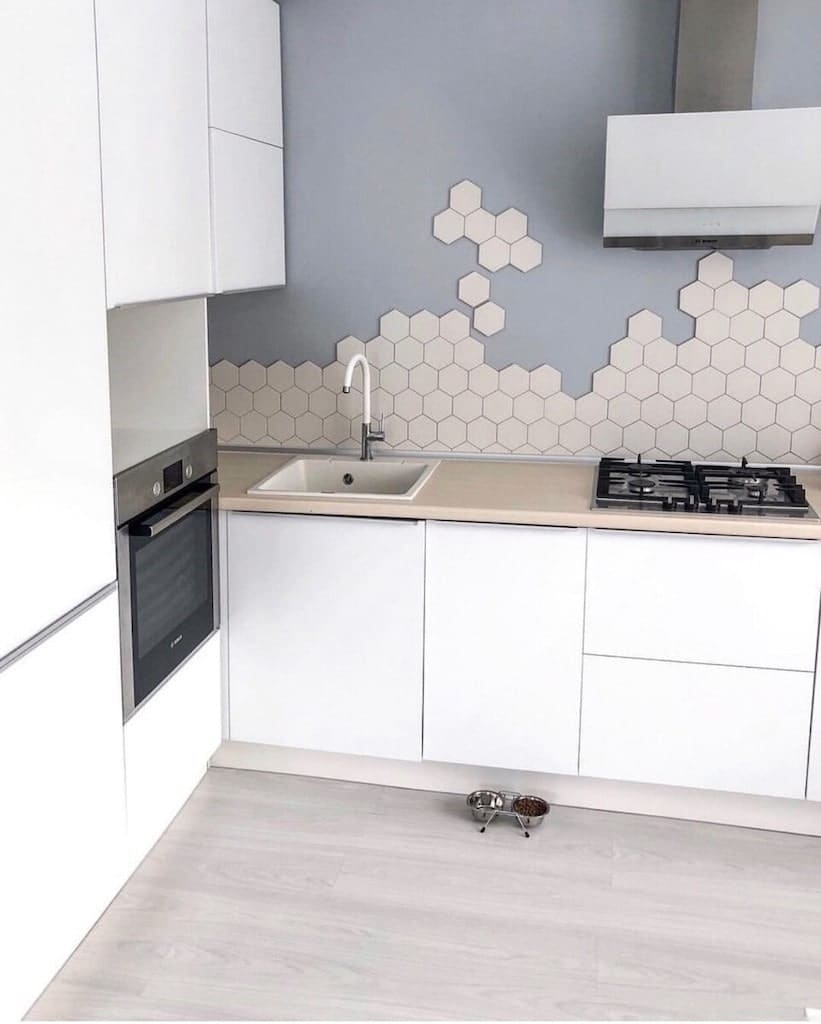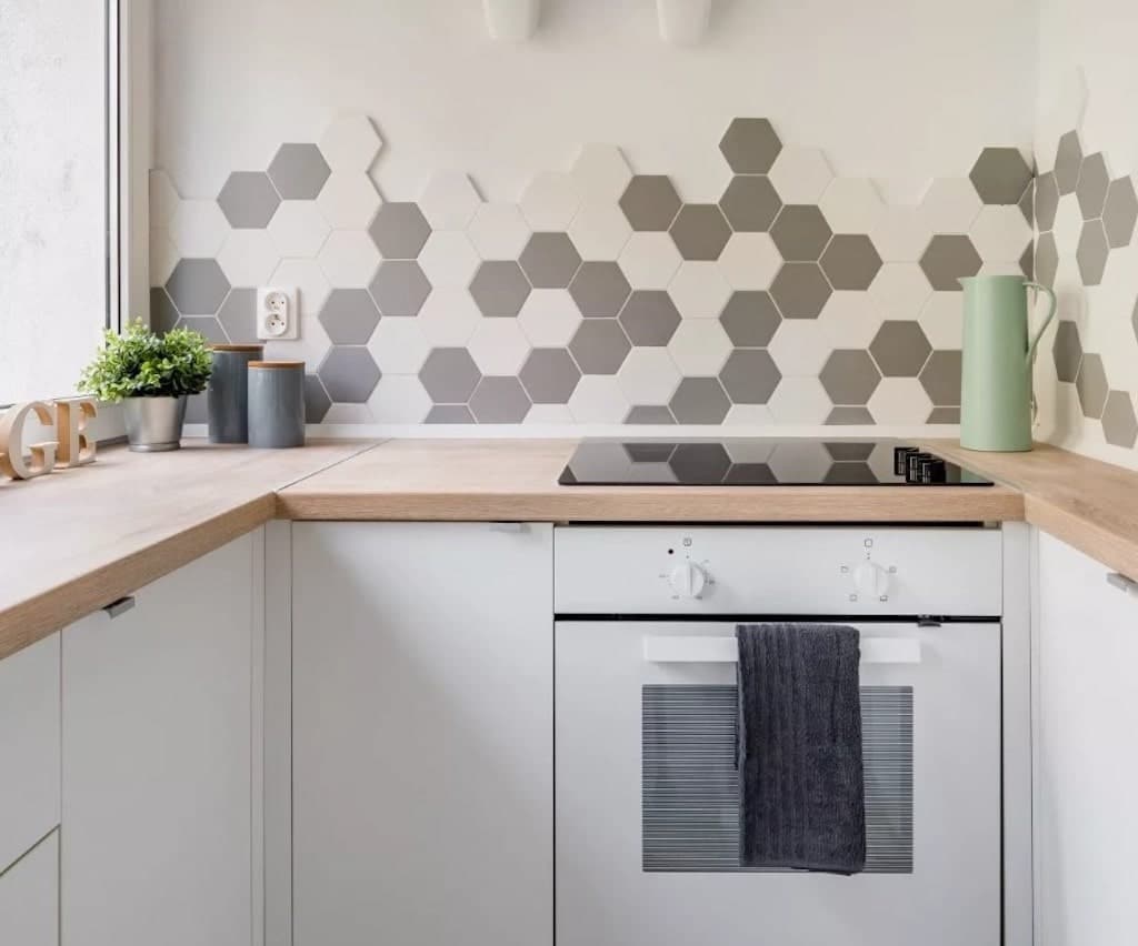 Облицовка стен в виде сот станет прекрасным украшением вашей кухни. Вы можете выбрать один или несколько цветов, сочетающихся с дизайном помещения. Декоративная укладка плитки отлично подходит природному цвету столешницы.