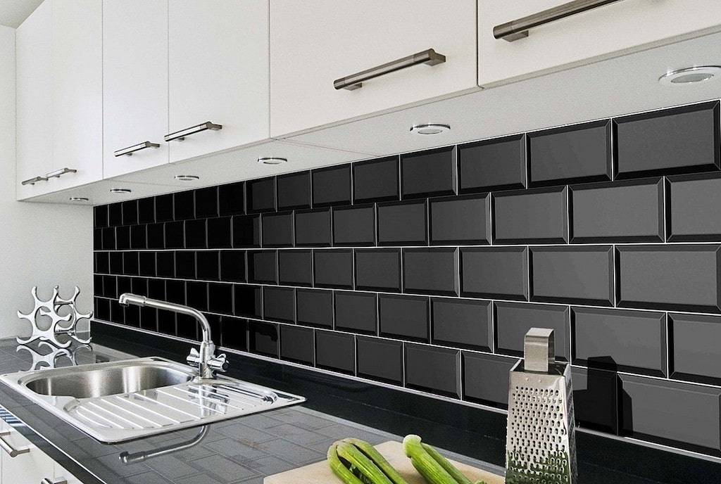 Контрастный фартук черного цвета — смелый и красивый выбор. Вытянутая кирпичная форма зрительно увеличит пространство. При использовании черного фартука вы можете остановить свой выбор на пластиковой кухне и металлической столешнице — результат будет великолепный.