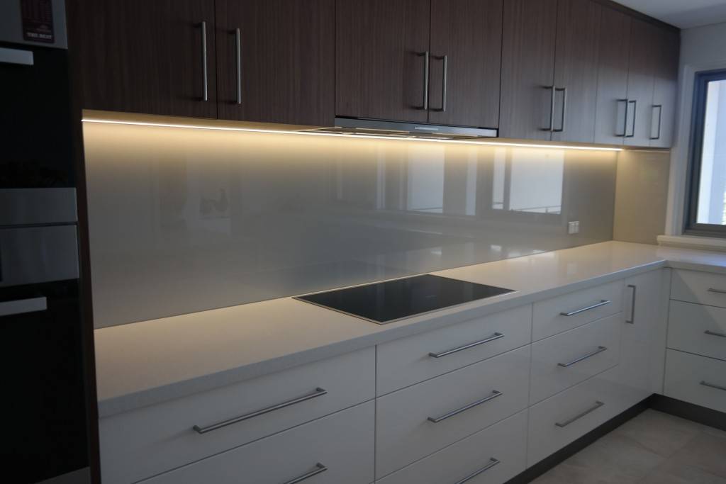 Стеклянный кухонный фартук как никакой другой сочетается с любой подсветкой.