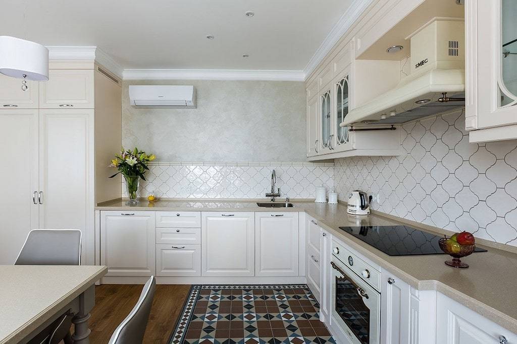 Наиболее популярный материал для классической белой кухни — керамическая плитка.