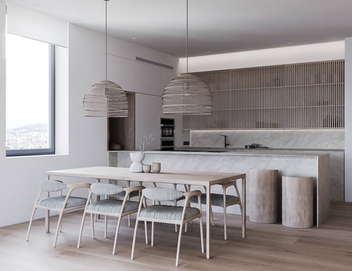 Допускается использование не более трех цветов в интерьере, все они должны быть нейтральными и приглушенными. Светлые тона в данном случае — просто идеальны. Используемая бытовая техника — только встроенная, должно присутствовать хорошее естественное освещение, и несколько источников искусственного света.