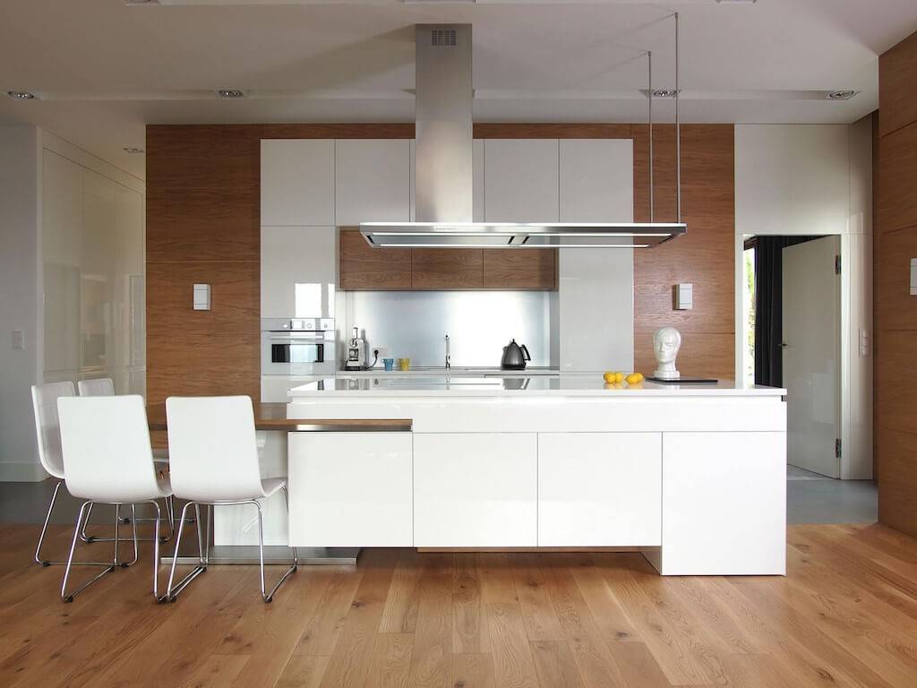 Очень важно соблюсти пропорции: 70% белого + 30% дерева. Если выбраны глянцевые фасады, то и рабочая зона должна блестеть — для этого используют лаковое покрытие