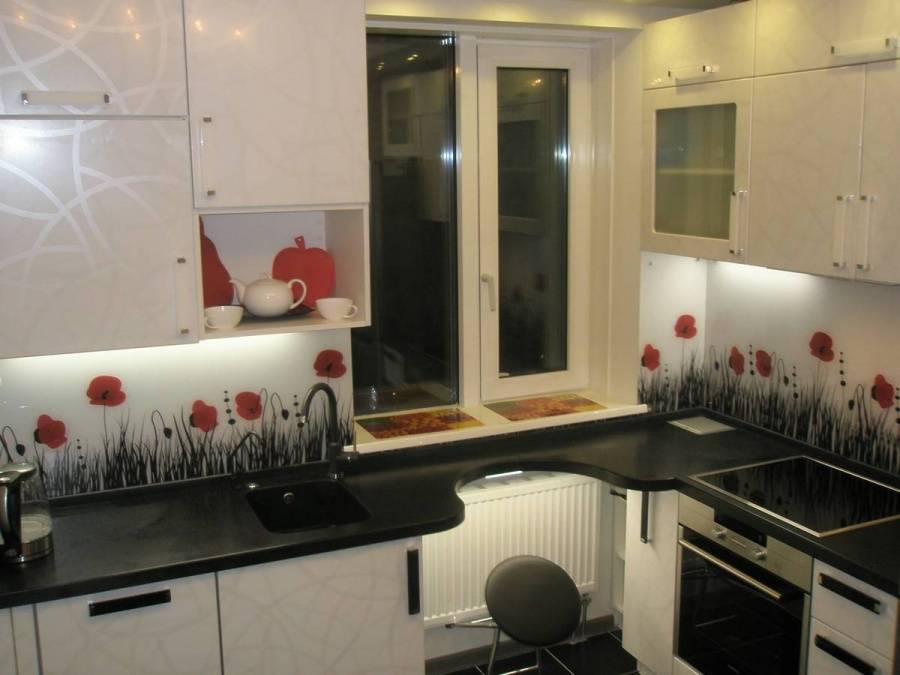 Что касается скинали с рисунком, здесь нужно подходить очень осторожно. Любое разноцветье будет смотреться не гармонично, а вот алые маки или желтые тюльпаны на белом фоне станут отличной деталью интерьера