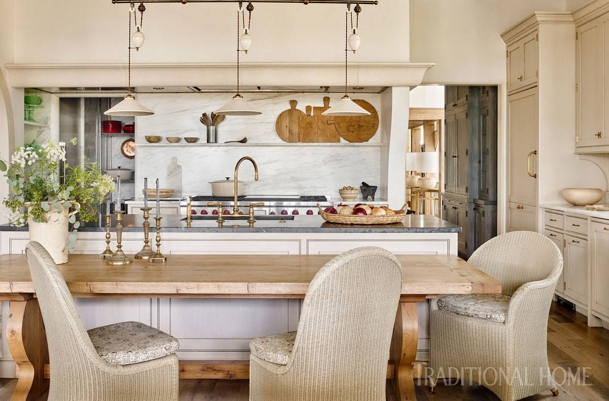 Неоклассический стиль этого интерьера интересен фартуком с узорами, сочетающимися с рисунком ковра.