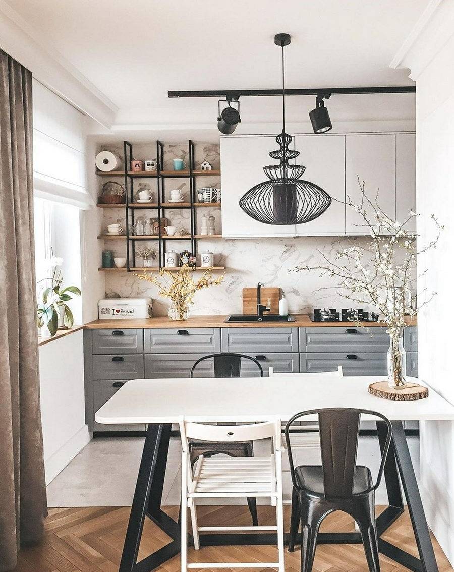 Серый кабанчик прекрасно оттеняет светлое дерево и отлично сочетается с белизной кухни и фурнитурой металлик. Дощатый пол, выкрашенный серой краской, завершает картину и придает интерьеру гармоничный вид.