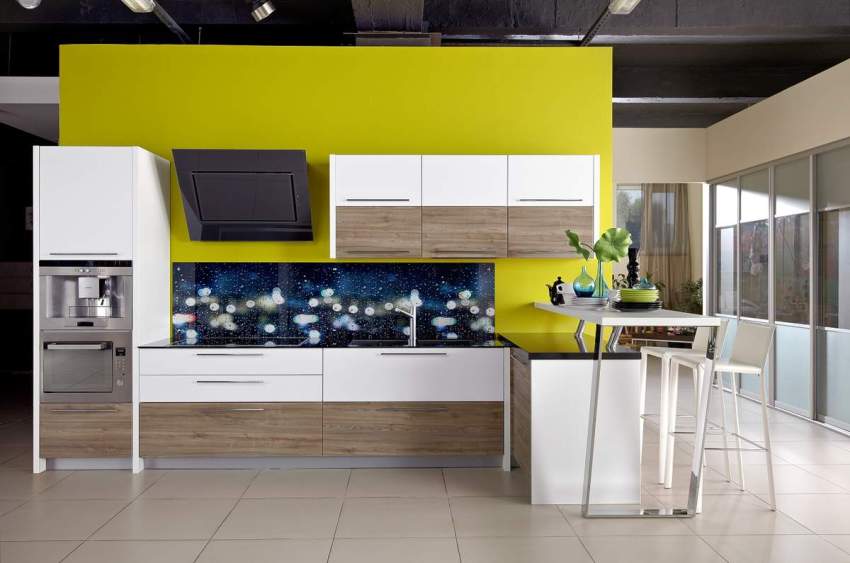Если собираетесь делать кухню в монохромных цветах, учтите, что у вас всегда будет много предметов для готовки пищи, которые не всегда можно легко найти в черно-белом. Хорошая идея совместить монохромную кухню и оттенки зеленого, например салатовый. Это естественное природное сочетание всегда актуально, а главное в салатовом много кухонной утвари, например разделочных досок, прихваток, подставок под горячее и т.д. Есть интересная комбинация: белая кухня с деревянной столешницей и стеклянным фартуком, под которым изображение травы. Получается полное заимствование цветов из природы.