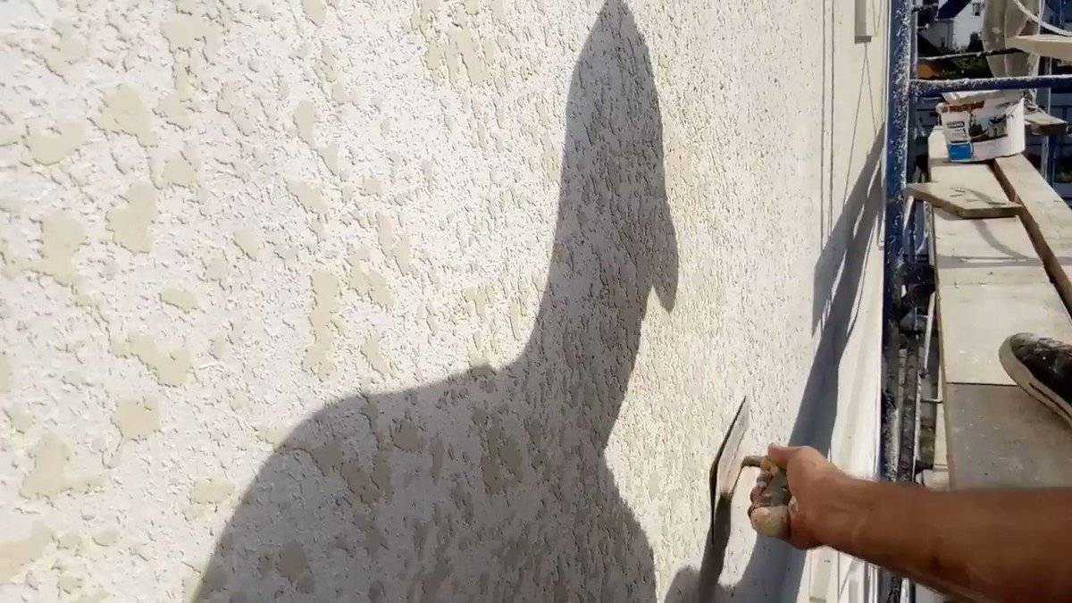В одиночку оштукатуривать фасад таким материалом сложно, так как требуется ещё и периодически перемешивать штукатурку в ведре, чтобы она не расслоилась и не застыла. Поэтому она обычно выполняется в четыре руки – один человек распределяет смесь по поверхности, второй следом затирает.