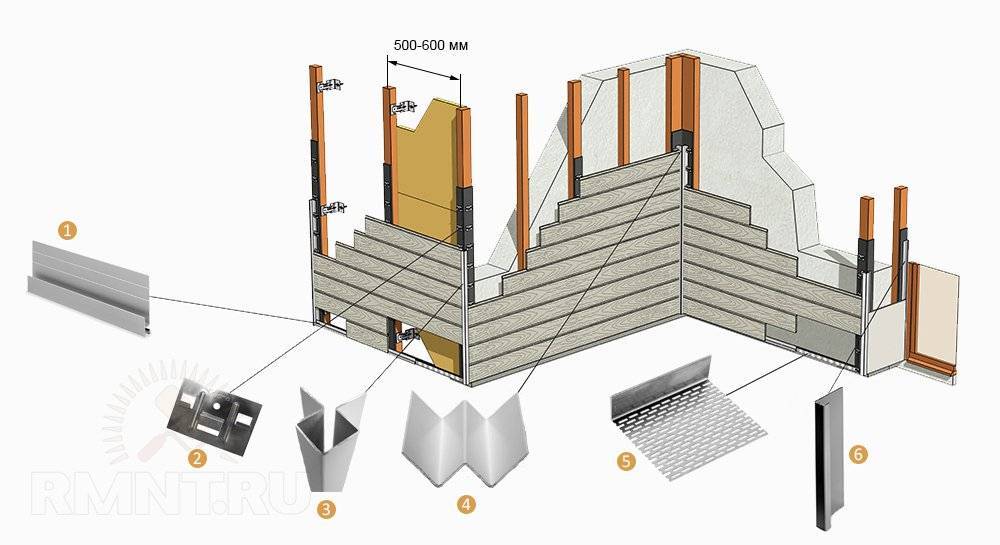 Схема монтажа и доборные элементы фиброцементного сайдинга: 1 — стартовый профиль; 2 — кляммер; 3 — внешний угловой профиль; 4 — внутренний угловой профиль; 5 — вентиляционный профиль; 6 — конечный профиль