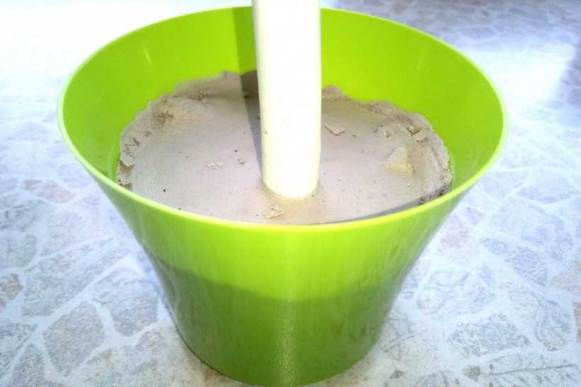 Для поделки понадобится ровный лист фанеры, на который можно будет установить форму. Второй шаг – подготовить раствор однородной консистенции и ввести в землю примерно на 35 см заранее отрезанные куски труб. Изделие большего диаметра устанавливают в место монтажа поилки. Оставшийся кусок трубы оставляют для дальнейших работ.