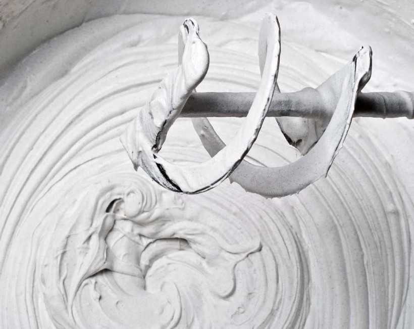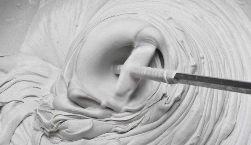 - Для отливки требуется раствор с консистенцией жидкой сметаны и поэтому воду и гипс разводят в пропорции 1:1. При этом следует добавлять гипсовый порошок в воду, а не наоборот. Сыпучее вещество тонкой струйкой всыпают в жидкость, помешивая лопаткой. Большой объём лучше всего помешивать строительным миксером или вручную.