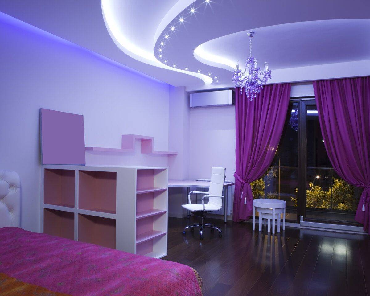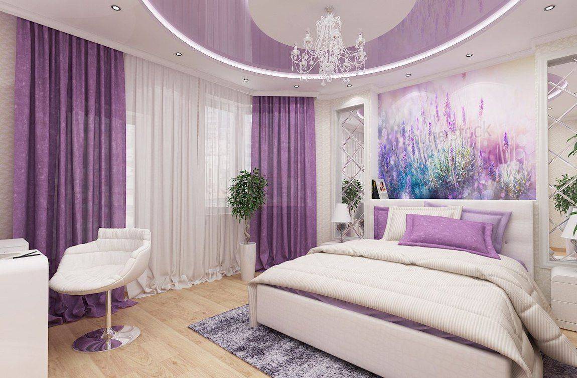 При оформлении фиолетовым цветом потолка, лучше покрыть стены другим, сочетающимся с ним оттенком. Рациональным решением будет и использование дополнительных элементов сиреневого оттенка, например, штор и текстиля.