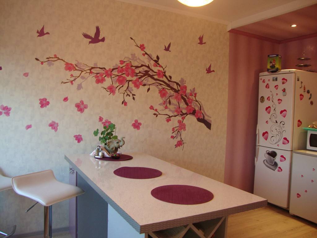 При обустройстве кухни-гостиной отлично будет смотреться сочетание обоев светло-фиолетового цвета с фактурной штукатуркой такого же оттенка (с помощью такого приема можно также зонировать помещение).
