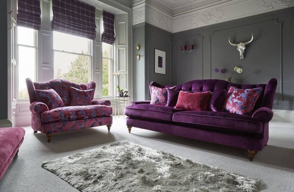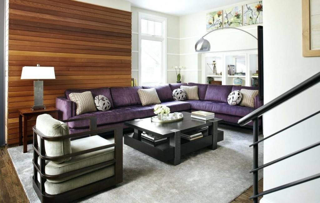 Лучшие сочетания цветовых оттенков с фиолетовым диваном в гостиной