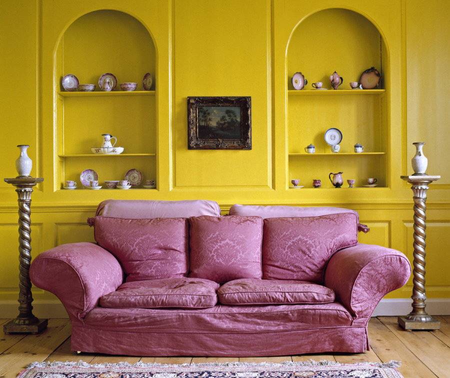 В северных комнатах теплую и жизнерадостную атмосферу можно создать при помощи дивана фиолетового цвета в интерьере, выдержанном в желтых и золотых тонах. Это очень эффектное сочетание, которое не оставит никого равнодушным. Создать гармоничный интерьер поможет правило: чем насыщеннее фиолетовый, тем бледнее должен быть желтый. Излишняя яркость будет раздражать и мешать расслабиться. Разбавив холодность темно-фиолетового дивана канареечными подушками и нежно-желтыми шторами, можно создать солнечную летнюю атмосферу посреди холодного мегаполиса.