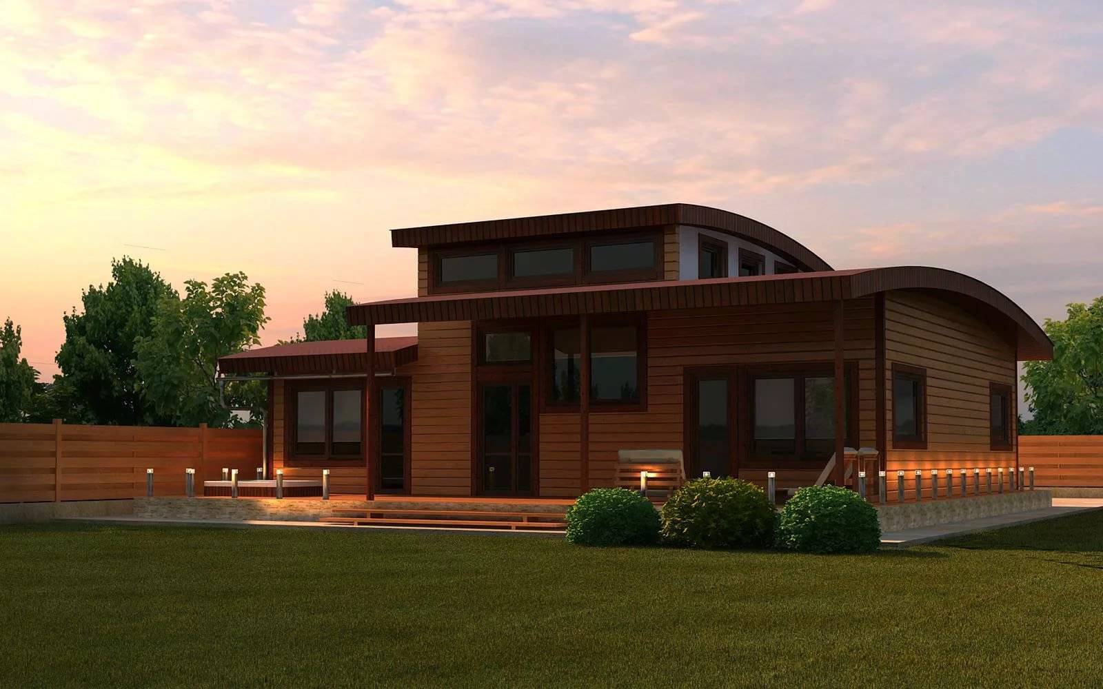 вальмовая кровля с дугообразным склоном (по типу пагоды) встречается нечасто из-за сложности изготовления. Но внешний вид имеет очень привлекательный, оригинальный;