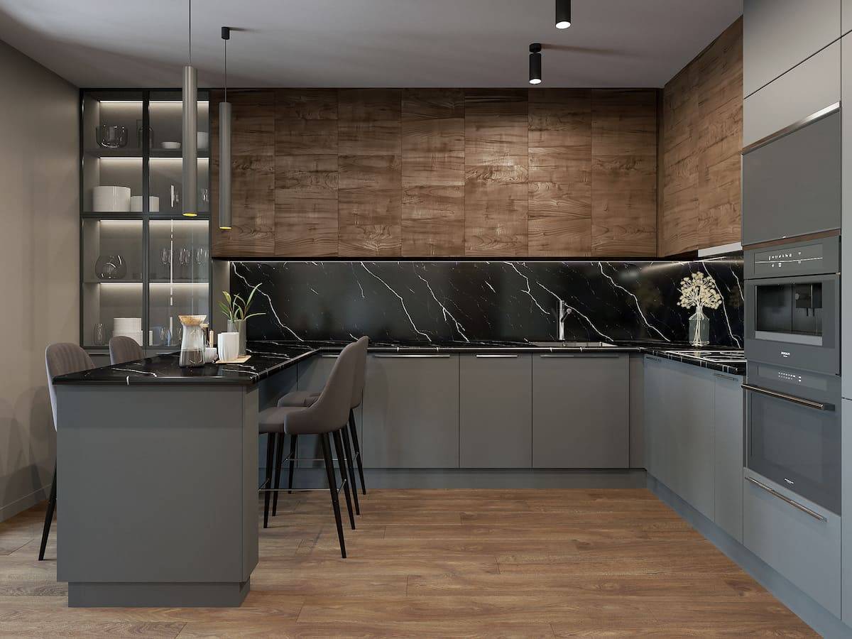 Более тёмный цвет венге создаст красивый контраст со светлым поверхностями и глянцевыми текстурами в современном интерьере
