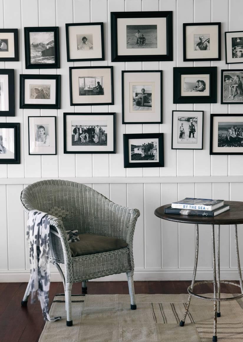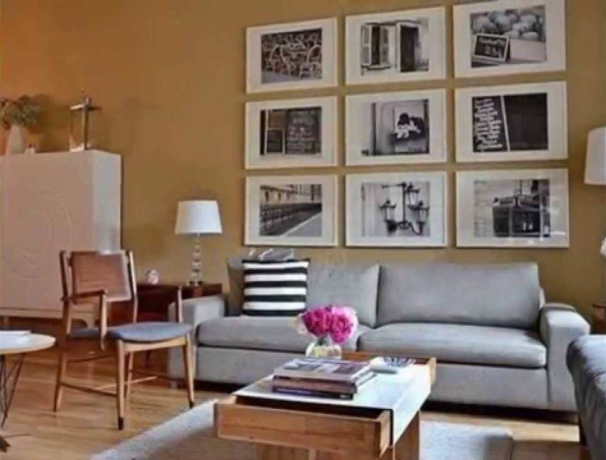 Фотографии можно разместить в любой комнате в частном доме или квартире. Основное правило: стиль оформления должен соответствовать дизайну помещения, гармонировать по цветовой гамме и общему восприятию. Можно пойти простым путём и купить одинаковые рамочки для всего панно, в таком случае их следует размещать как плитку по всей поверхности стены.