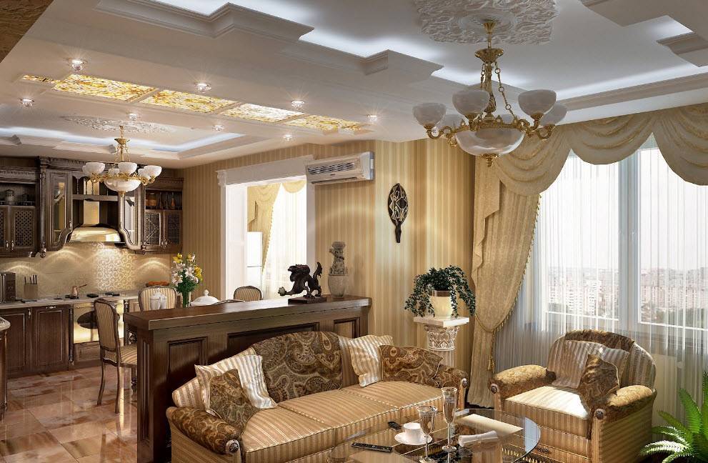 Интерьер гостиной комнаты совмещенной с кухней