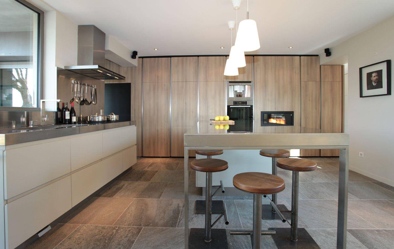 В частных домах принято располагать кухню на первом этаже. Столешницу с плитой и бытовой техникой лучше разместить у окна. В центре помещения надо поставить остров, который будет выполнять функцию барной стойки, стола и дополнительной рабочей поверхности.