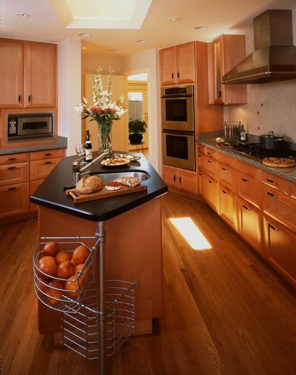 Большая кухня с мебелью из натурального дерева часто делается в разрыве: то есть гарнитур устанавливается отдельно друг от друга, в хаотичном порядке по разным сторонам. Просторное помещение позволяет расположить круглый островок с внутренними открытыми полками или винной нишей.
