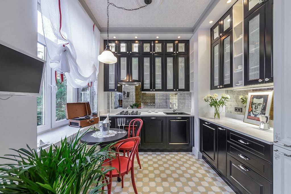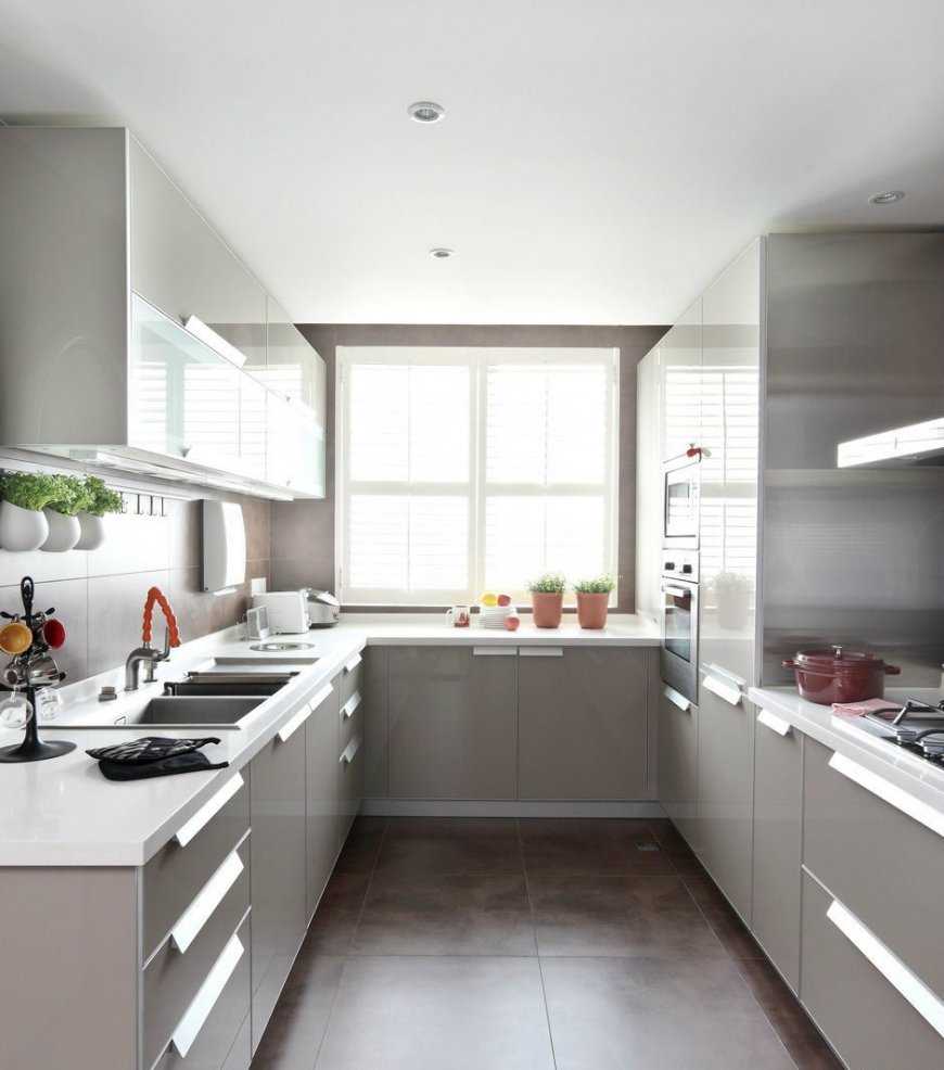 Не занимают места еще и двери-гармошки. Они удобны и долговечны, легко эксплуатируются и устанавливаются. Некоторые модели можно заказать индивидуально под арку. Для обустройства малогабаритной кухни используют Г-образную, линейную и реже угловую мебель. Последняя подходит даже для квадратных по форме помещений.