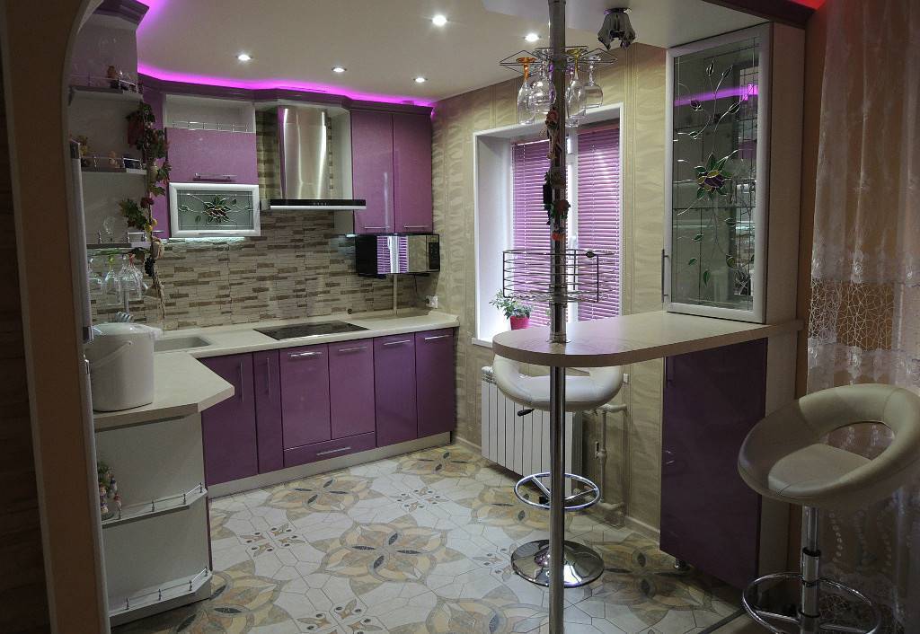 - Оригинальный дизайн, например, Г-образная кухня с панорамным окном.