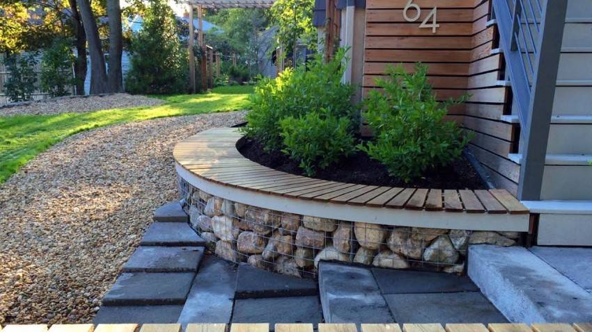 - Создание подпорной стенки. Еще один распространенный вариант применение габиона на дачном участке. Если вам необходимо создать высокую клумбу, и вы не знаете, как это осуществить, достаточно разделить эту клумбу с остальной частью территории при помощи одиноко стоящего габиона прямоугольной формы. Специалисты рекомендуют встраивать в такое сооружение лавочку. В итоге получится конструкция, которая будет великолепно смотреться в общей картине приусадебного дизайна: клумба, возвышающаяся над габионами, набитыми камнями, и лавочка, расположенная непосредственно под ней и обозначающая зону отдыха и релакса.