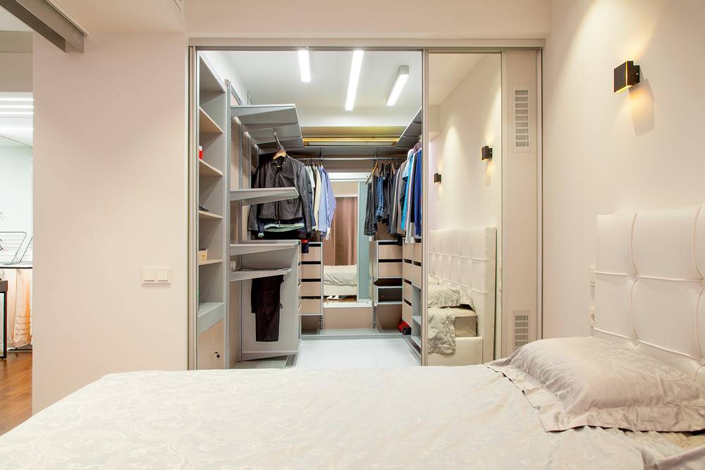 Чаще всего гардеробную комнату оборудуют в спальне. Такое решение позволяет избавить квартиру от большого количества мебели. Ведь все вещи перемещаются в одно место. Вся одежда распределена по полкам. Таким образом, создается система для комфортного хранения.