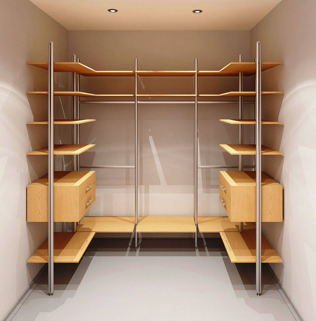Подобную комнату можно устроить в доме или в квартире в любом помещении, кроме кухни. В проекте гардеробной 2 на 2 стеллажи для вещей должны гармонично вписываться в общий интерьер.