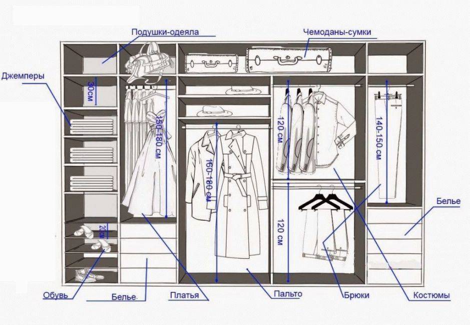 - для нормальной эксплуатации необходимо соблюдать такие расстояния: между полками для одежды – от 30 см, между полками для обуви – от 20 см, секция для рубашек – от 120 см, секция для брюк – от 140 см, отдел для платьев – от 150 см и отдел под верхнюю одежду – от 160 см