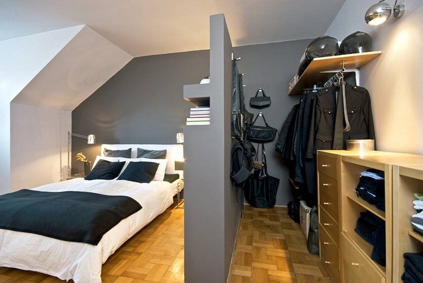 - Если она маленькая, то поставьте мини-гардеробную, где будут находиться самые необходимые вещи и ничего лишнего!