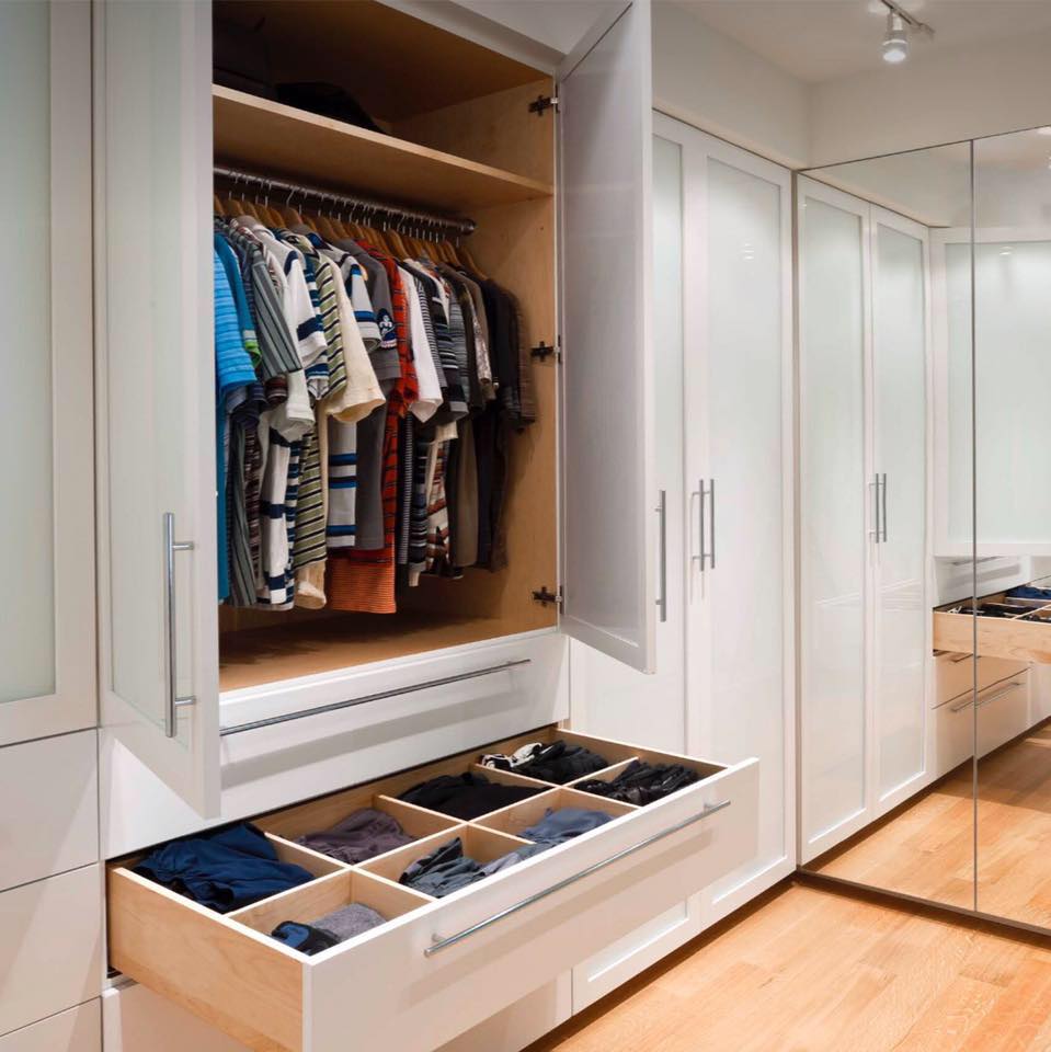 Среди многочисленного мужского и женского гардеробов есть определенные типы одежды, которые просто так не сложишь на полке. Для них необходимо подбирать специальные полки и ящики и в дальнейшем встраивать их в общий вид комнаты.