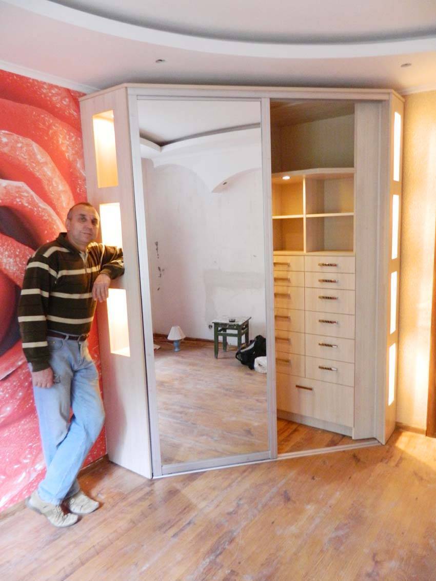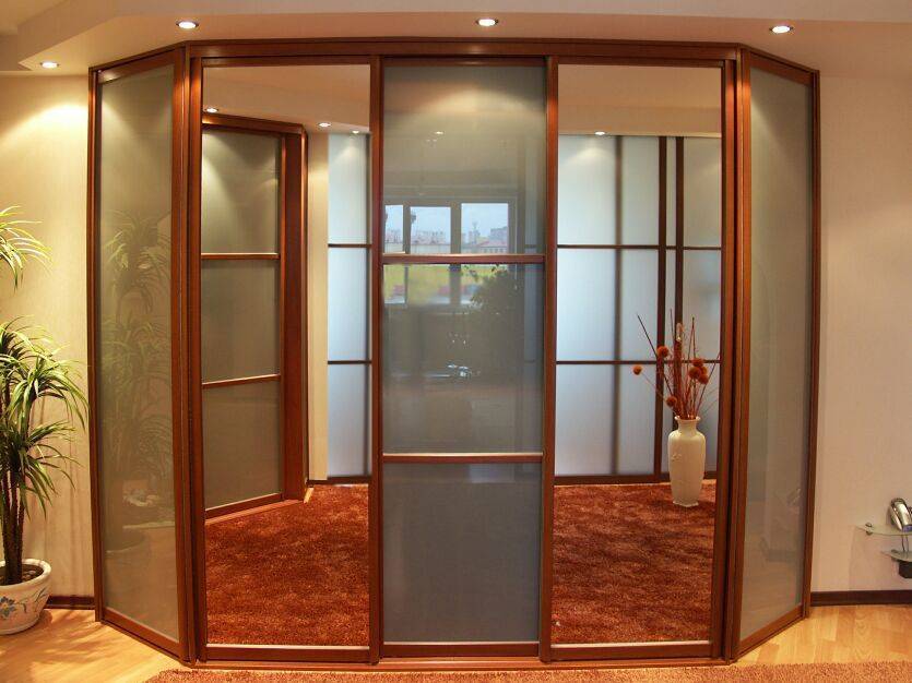 Треугольная гардеробная комната может стать еще более вместительной и просторной, если двери по диагонали сделать не прямыми, а полукруглыми. Радиусные двери купе двигаются не по прямым направляющим, а по закругленным. Как показывает практика, они не менее удобны в использовании, долговечны, практичны, поэтому не стоит отказываться от их установки.