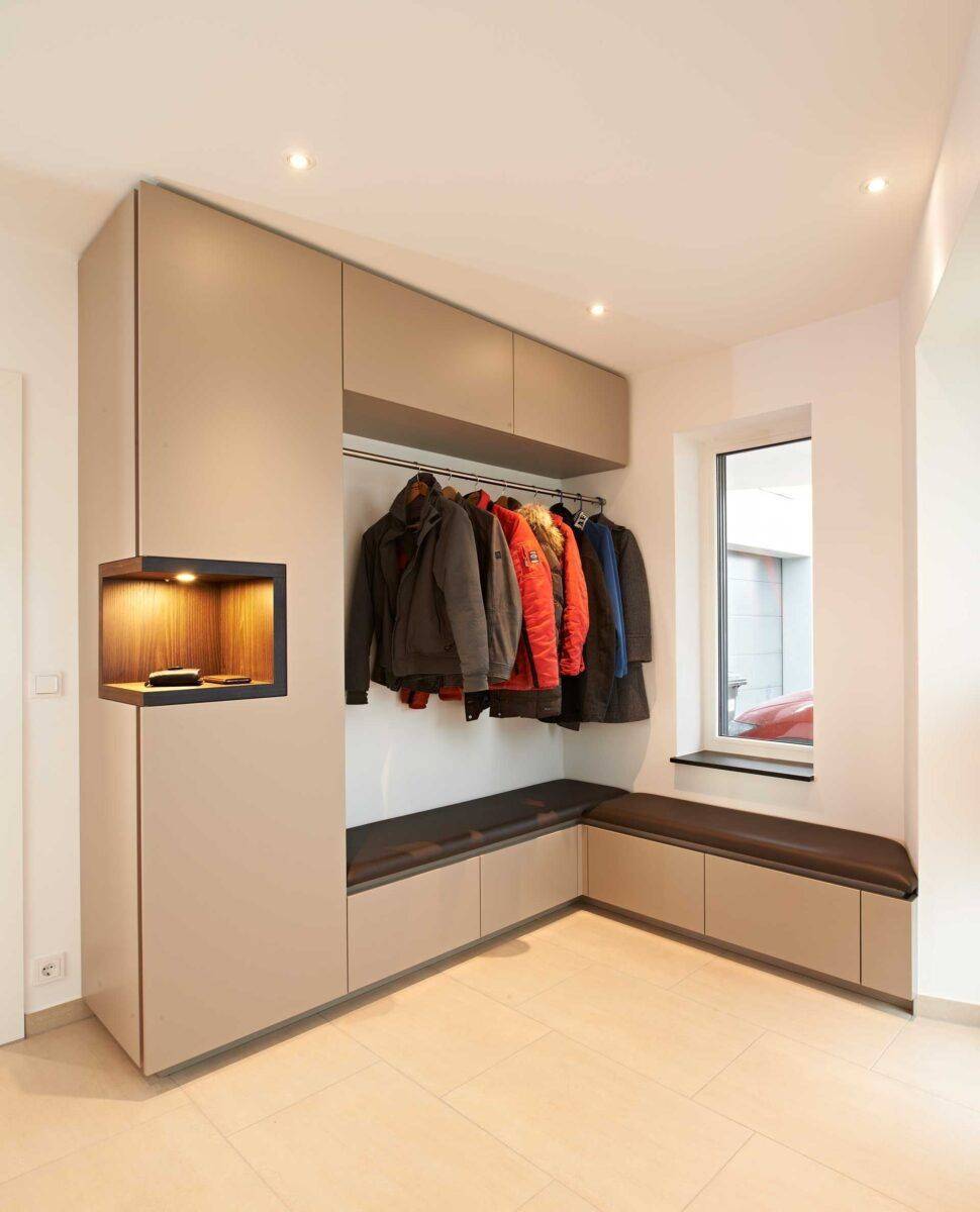 К очевидным плюсам обустройства гардеробной именно в прихожей следует отнести: