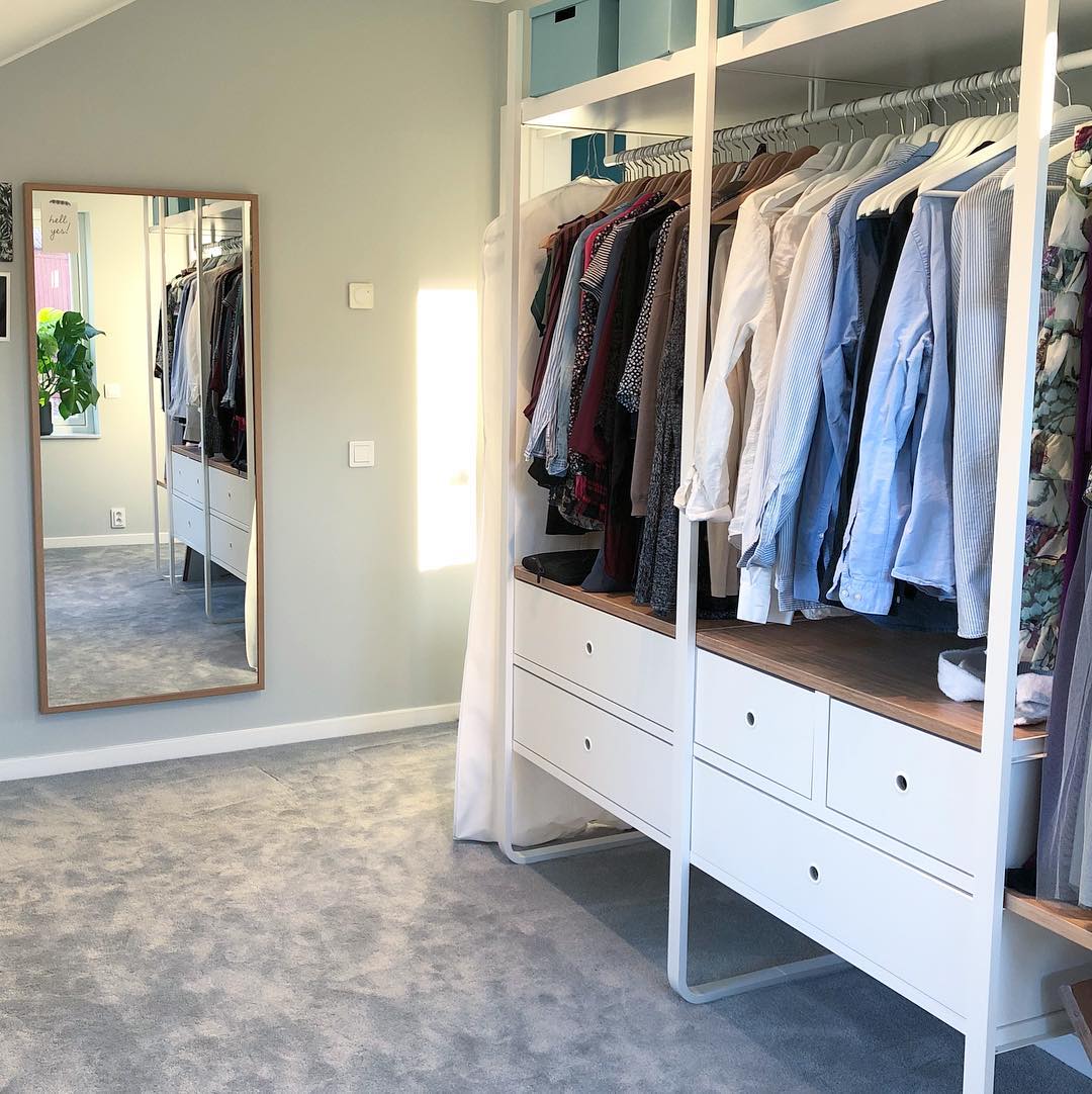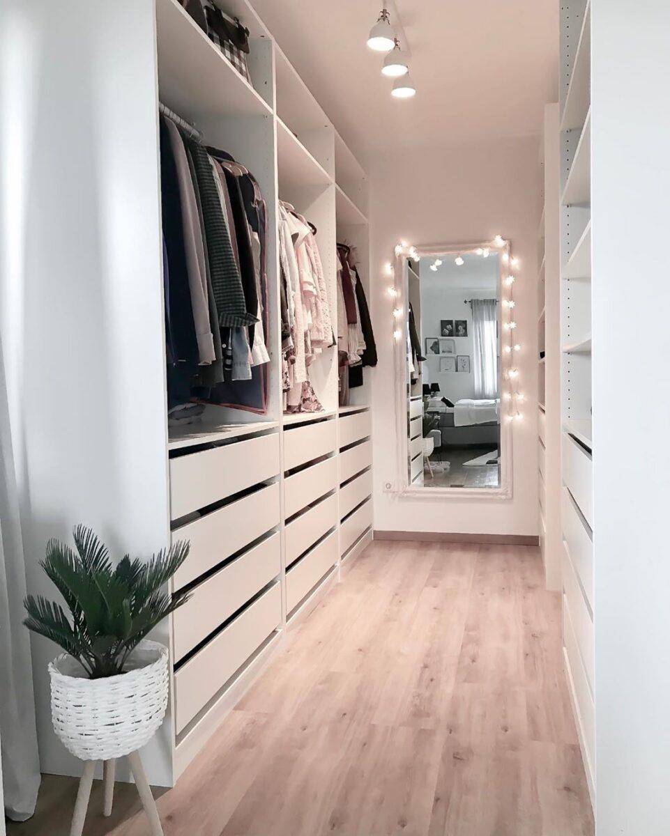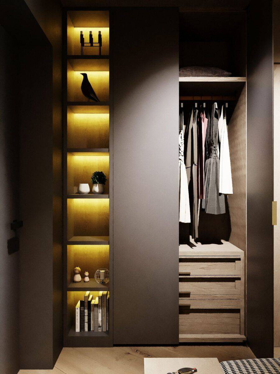 Занимать и без того небольшое пространство не стоит. Лучшими показателями в этом сегменте обладают встроенные гардеробные шкафы и стеллажи. Они применимы, к слову, также и для малых квартир, где нет возможности создать гардеробную.