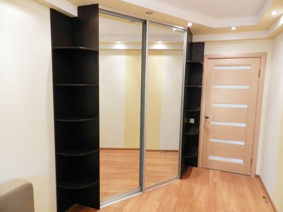 - Корректировка помещения. Встроенный гардероб станет идеальным решением для заполнения ниши или небольшой кладовки, которую не планировалось использовать по-другому. Гардеробный шкаф может отлично замаскировать неровности и изъяны стены. Зеркало, украшающее мебельный фасад, добавит в небольшое помещение света и зрительно расширит его.