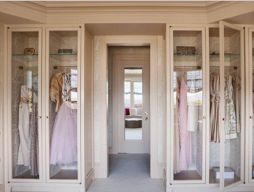 Заслуженной популярностью пользуются двери из матового стекла, что позволяет увеличить освещение в примерочной. Они могут быть монохромными, не привлекающими взгляд… Или напротив, мерцая лакированным коробом и патинированной фурнитурой, делать интерьер более изысканным.