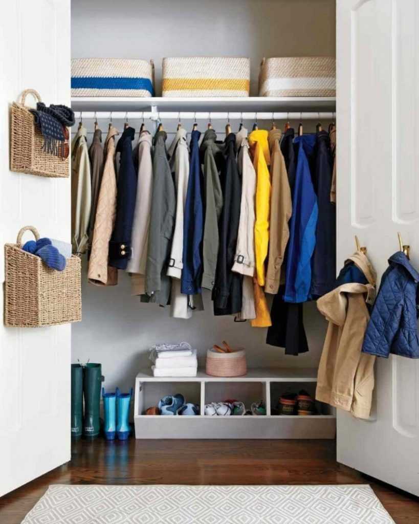 Плетеные корзины, ящики на колесиках – тоже не роскошь, потому что в подобных емкостях текстиль вентилируется и не требует дополнительного проветривания. В полноценных гардеробных размещают полноценную мебель: шифоньеры с множеством полок, этажерки, комоды.