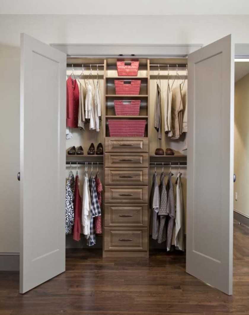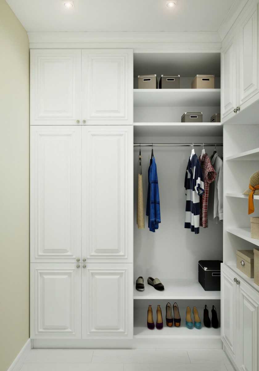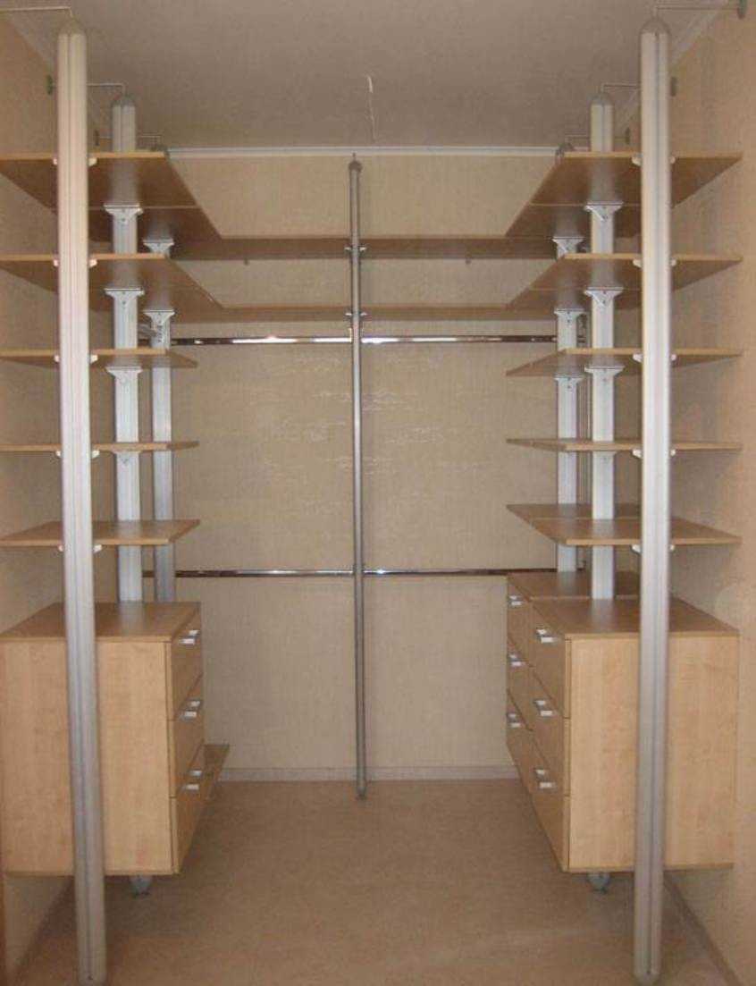 Небольшие гардеробные – сами по себе шкафы. В них крепят штанги, на которых устанавливают нужное количество полок, оставляя несколько перекладин для вещей на плечиках.